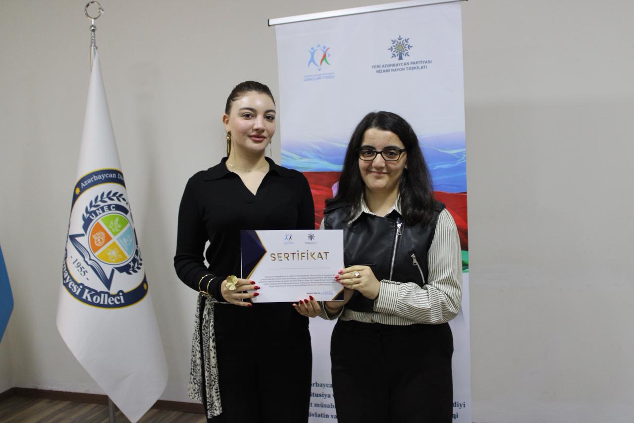 Tədbirdə YAP Nizami rayon təşkilatının məsləhətçisi Aytac Məhərrəmli, Qida Sənayesi Kollecinin təlim-tərbiyə işləri üzrə direktor müavini Aytən Ağayeva, kollecin azərbaycan dili və ədəbiyyat müəllimləri Lalə İsmayılova və Samirə Mehdiyeva, layihə rəhbəri Mürsəl Bəkirli və digər qonaqlar çıxış ediblər.
