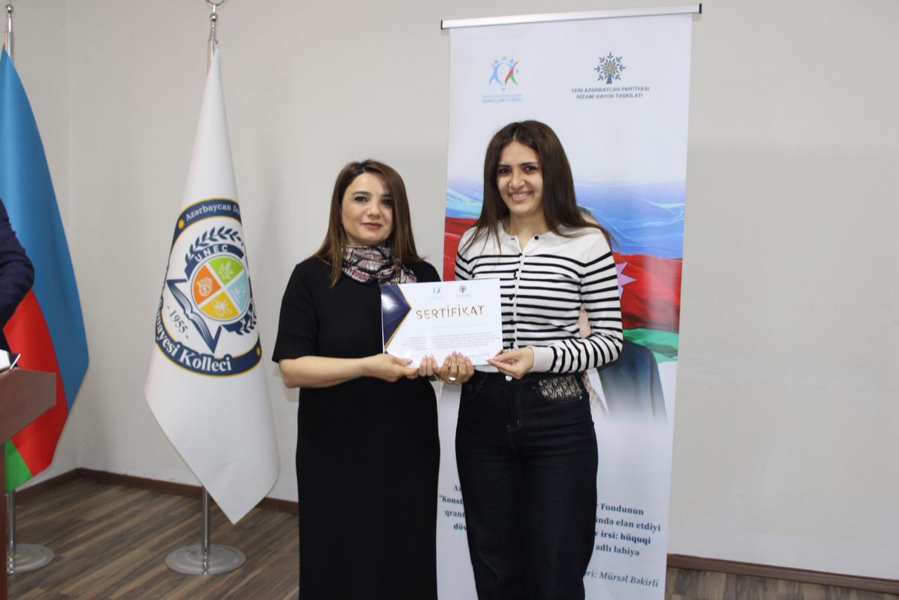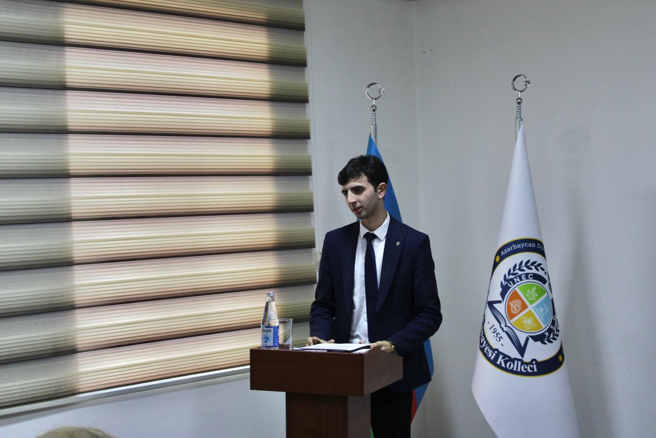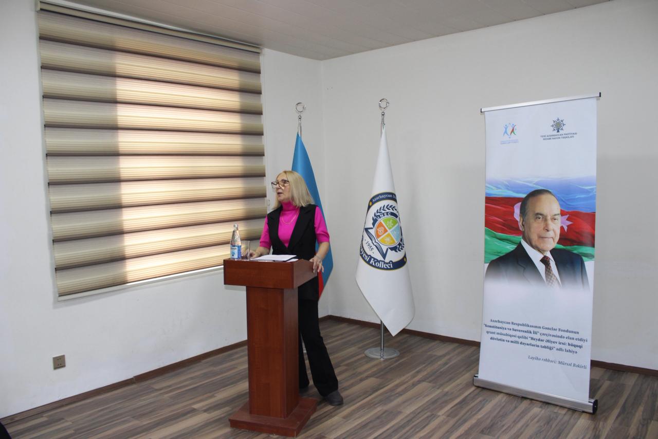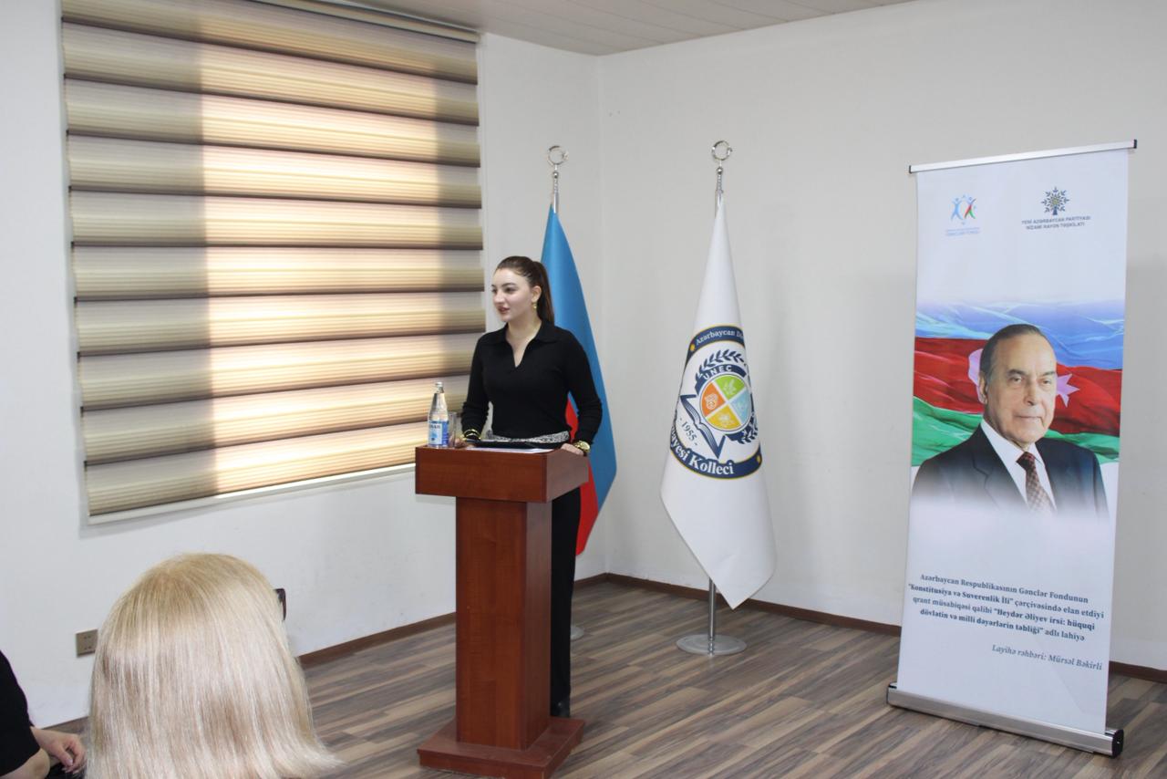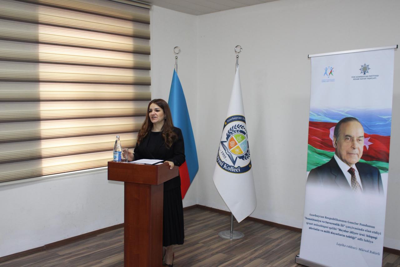 Azərbaycan Respublikası Gənclər Fondunun maliyyə dəstəyi ilə “Konstitusiya və Suverenlik İli” çərçivəsində həyata keçirilən “Heydər Əliyev irsi: hüquqi dövlətin və milli dəyərlərin təbliği” adlı layihə üzrə UNEC nəzdində Qida Sənayesi Kollecində ilk tədbir təşkil olunub.