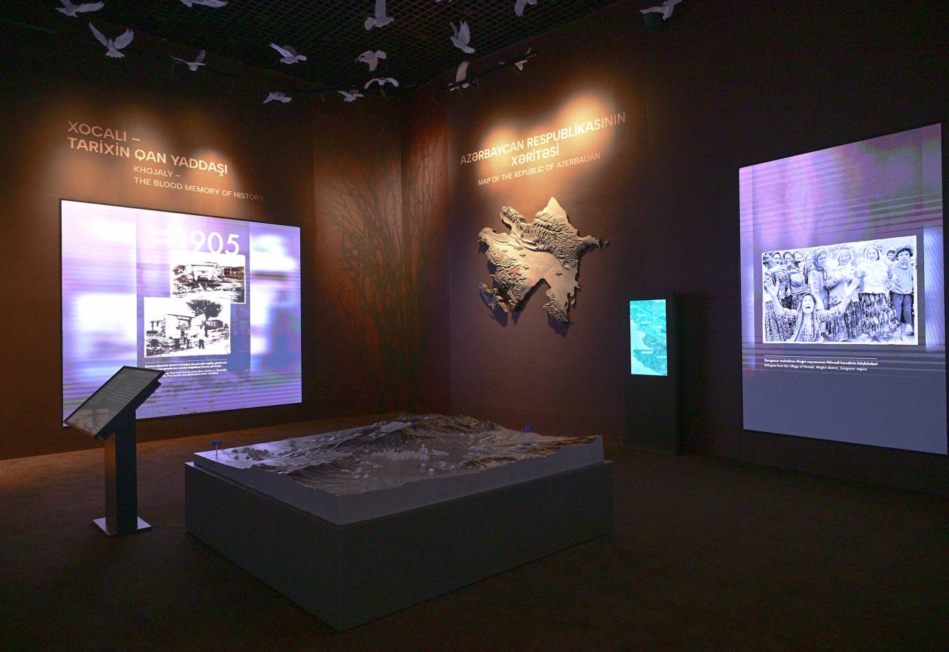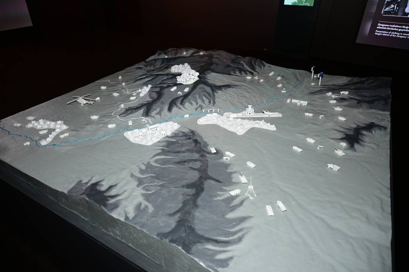 Ekspozisiya zalındakı Xocalı maketində faciə günü yaşanan dəhşətlərə dair məlumatlar interaktiv formada təqdim olunur.
