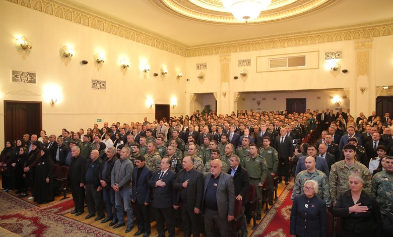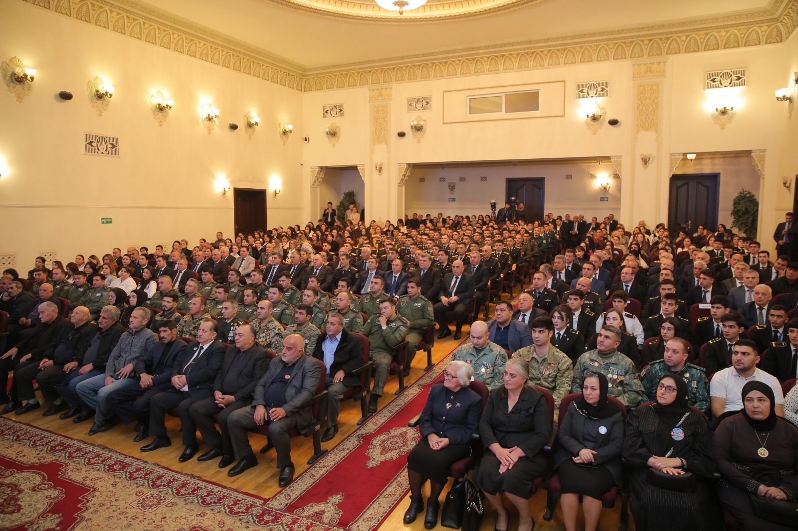 Daha sonra tədbirin rəsmi hissəsinə keçid edilərək Dövlət Himni səsləndirilib və ölkəmizin ərazi bütövlüyü və suverenliyi uğrunda mübarizədə canlarını qurban verən şəhidlərimizin xatirəsi bir dəqiqəlik sükutla yad edilib.