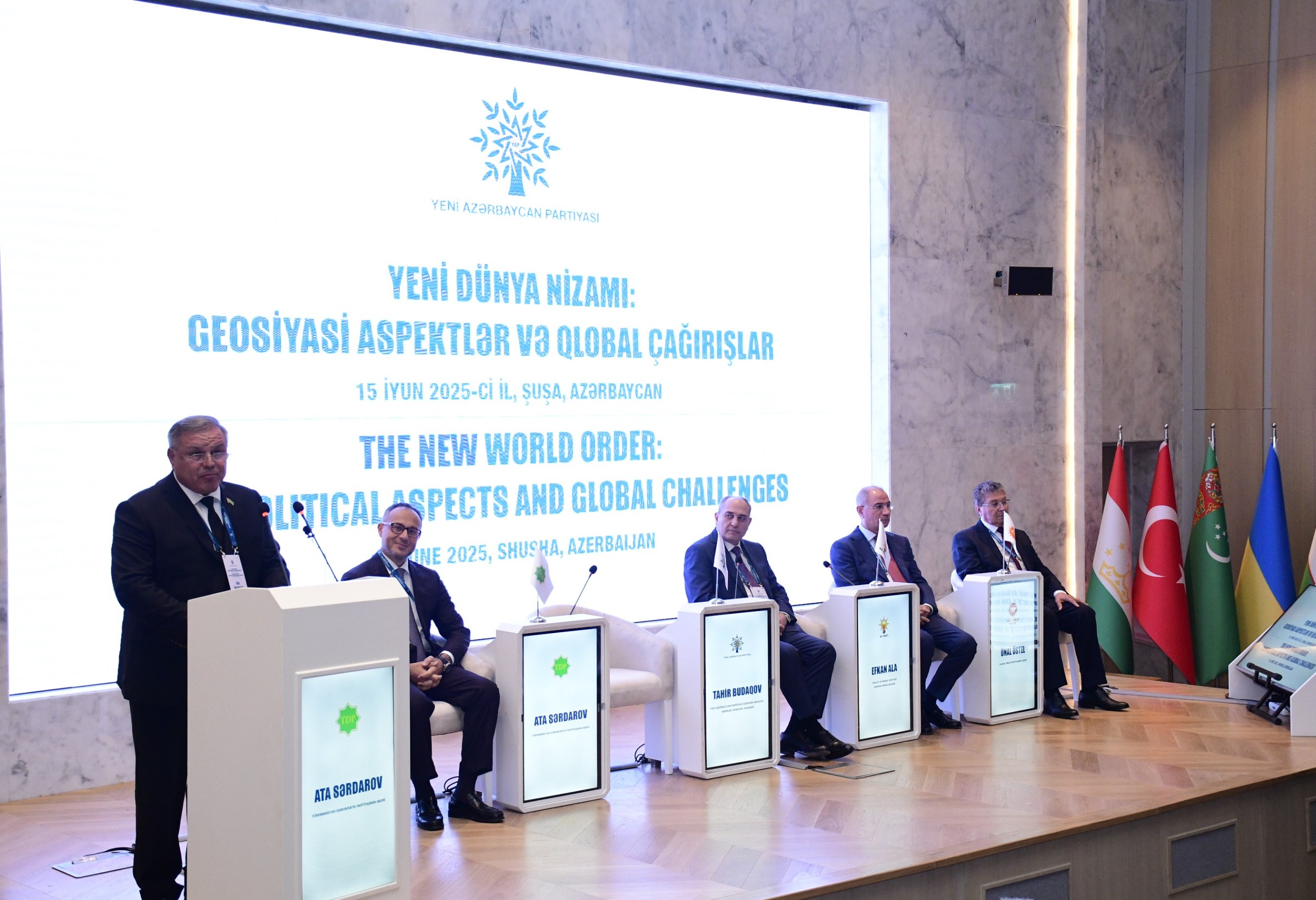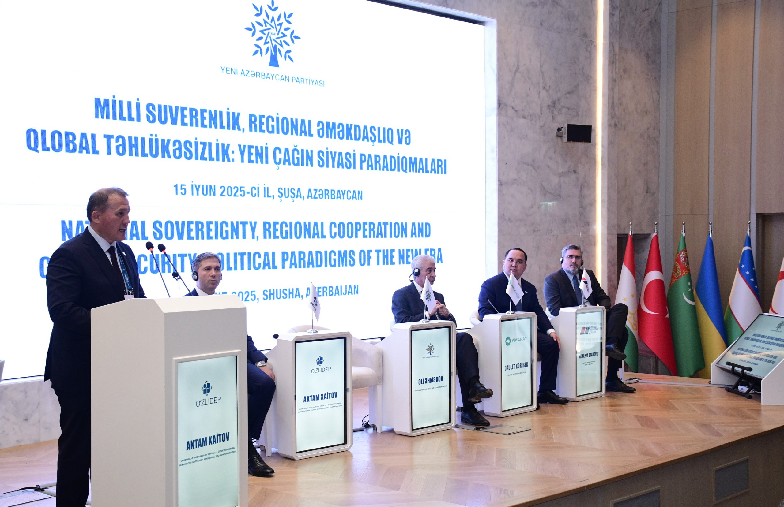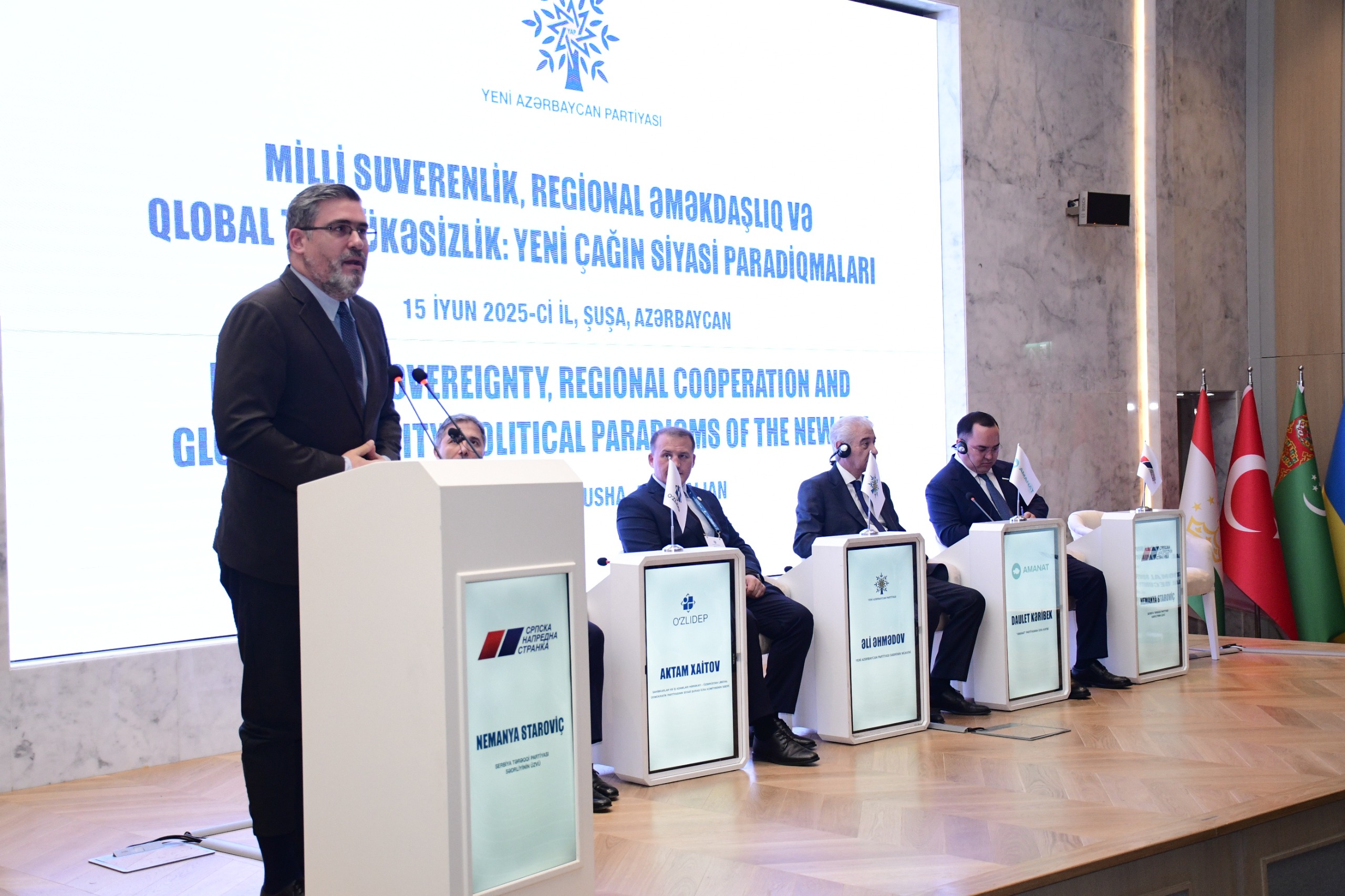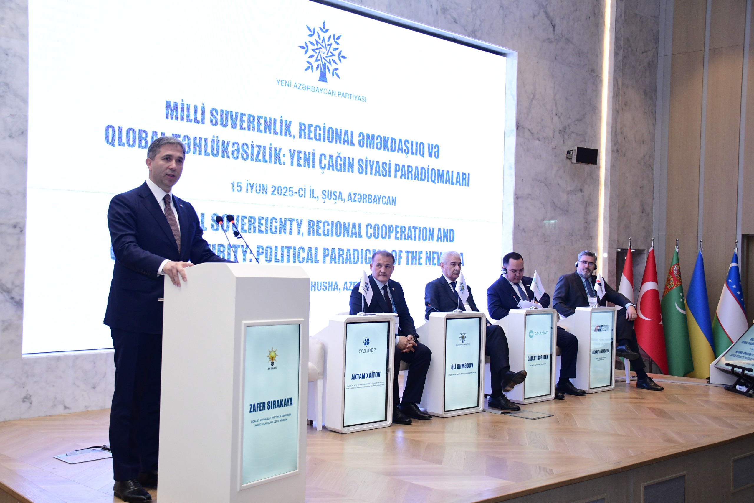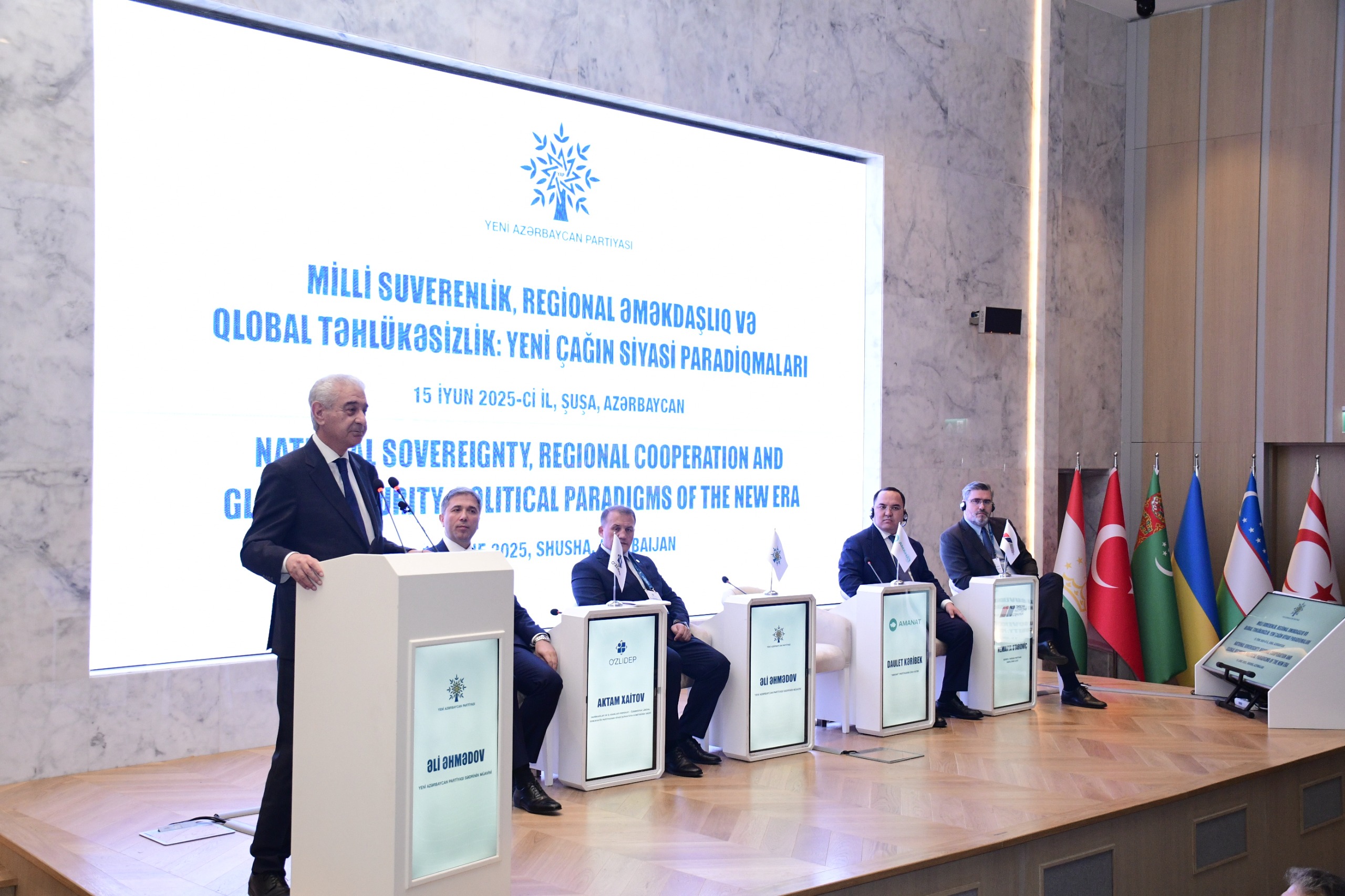 Türkiyənin Ədalət və İnkişaf Partiyası Sədrinin xarici əlaqələr üzrə müavini, Türkiyə Böyük Millət Məclisinin üzvü Zafer Sırakayanın moderatorluğu ilə “Milli suverenlik, regional əməkdaşlıq və qlobal təhlükəsizlik: yeni çağın siyasi paradiqmaları” mövzusunda keçirilən panel sessiyasında çıxış edən Yeni Azərbaycan Partiyası Sədrinin müavini, Azərbaycan Respublikası Milli Məclisi sədrinin birinci müavini Əli Əhmədov bildirib ki, Yeni Azərbaycan Partiyasının təşkil etdiyi konfrans son dərəcə əlamətdar bir gündə və məkanda keçirilir. Onun sözlərinə görə, xalqımız Ümummilli Lider Heydər Əliyevin hakimiyyətə qayıdışının – Milli Qurtuluş Gününün növbəti ildönümünü böyük hörmət və ehtiramla qeyd edir: “Əgər biz müasir Azərbaycanın həyatının ən başlıca siyasi simvollarının nədən ibarət olduğu haqqında sual versək, iki başlıca amili qeyd edə bilərik. Birincisi Heydər Əliyevin yaratdığı qüdrətli Azərbaycan – müstəqil Azərbaycan dövləti və dövlətçiliyidir. İkincisi isə bu dövlətin Prezident İlham Əliyevin rəhbərliyi altında qazandığı əzəmətli Qələbədir. Bu Qələbənin nəticəsi olaraq bu gün biz Şuşa şəhərində bu gözəl tədbiri keçirə bilirik. Beləliklə, Qurtuluş məfkurəsi yaşayır, Heydər Əliyev siyasəti yaşayır, Heydər Əliyev siyasəti Prezident İlham Əliyevin həyata keçirdiyi doktrinada özünün ətraflı ifadəsini tapır, Azərbaycana yeni uğurlar və qələbələr gətirir. Dünən də belə olub, bu gün də belədir, gələcəkdə də belə olacaq”.